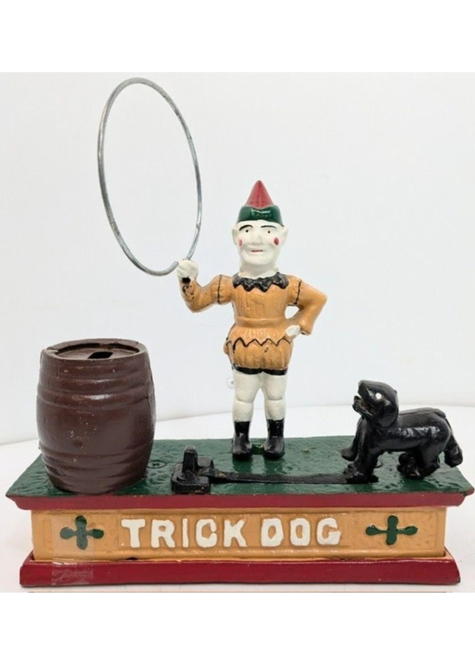 Vintage "Trick Dog" painted cast iron mechanical bank. In working condition with the bottom stopper intact. 7.25" width x 2.5" length x 8.25" height